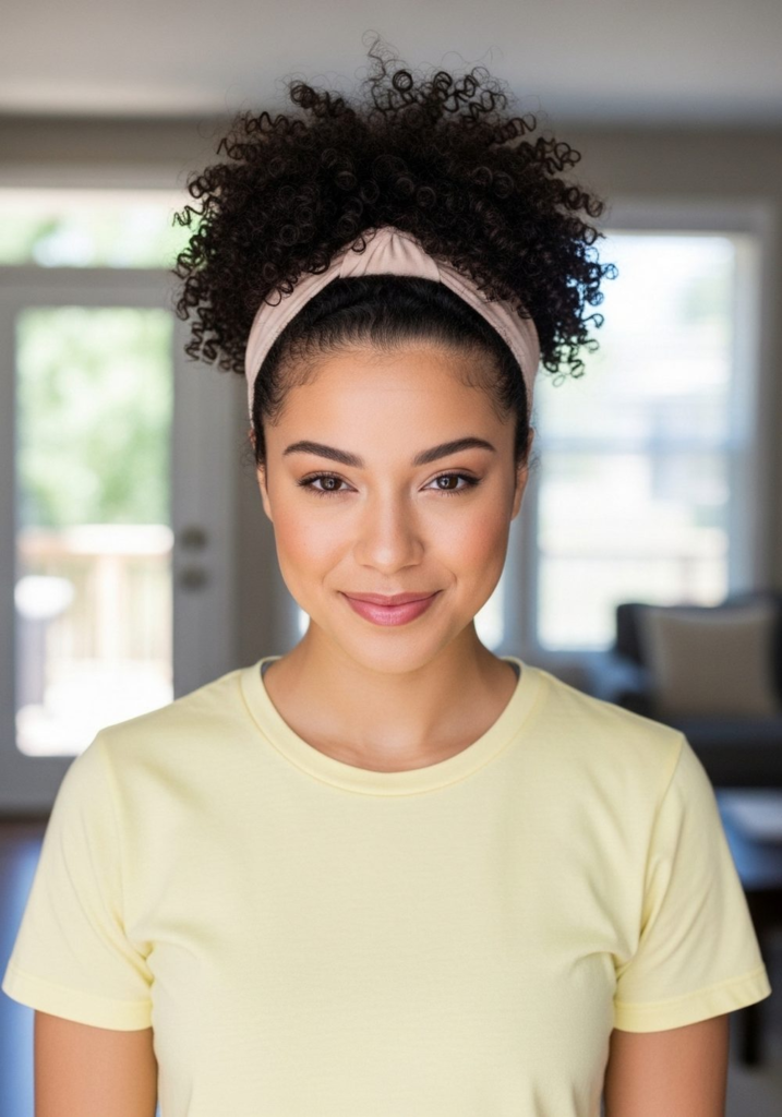 For natural hair days, I go with a headband puff. It’s quick, comfortable, and keeps my hair off my neck. The headband helps control the front during movement.