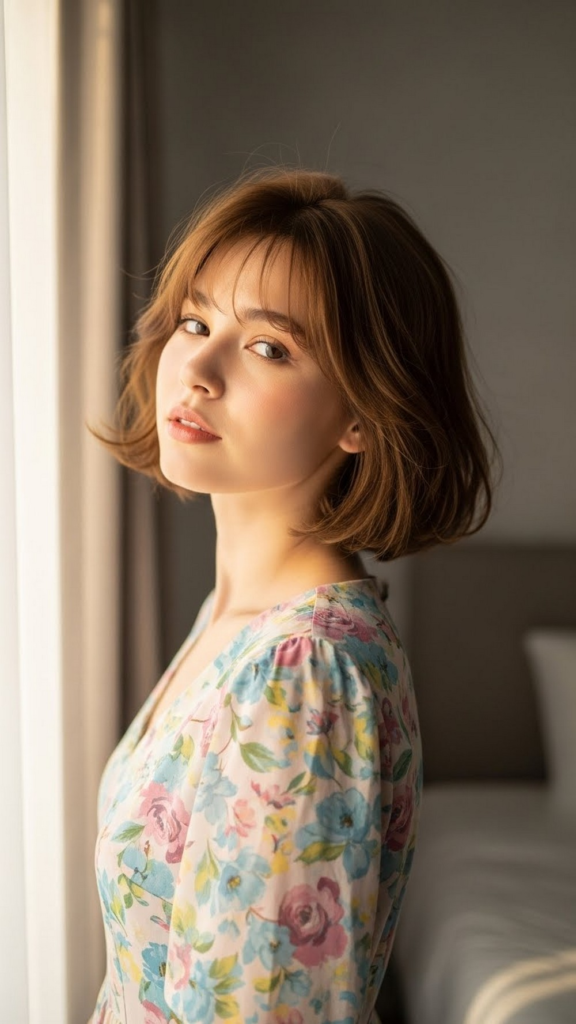 I like this version because it keeps a bit of length while still giving that soft, rounded shape. The layers sit around the chin and gently frame the face, which helps soften sharp jawlines. In my experience, this works really well for daily wear because it looks neat without effort. I always suggest keeping the ends slightly curved inward so styling stays easy. This is one of the safest options if you’re trying short hair for the first time.