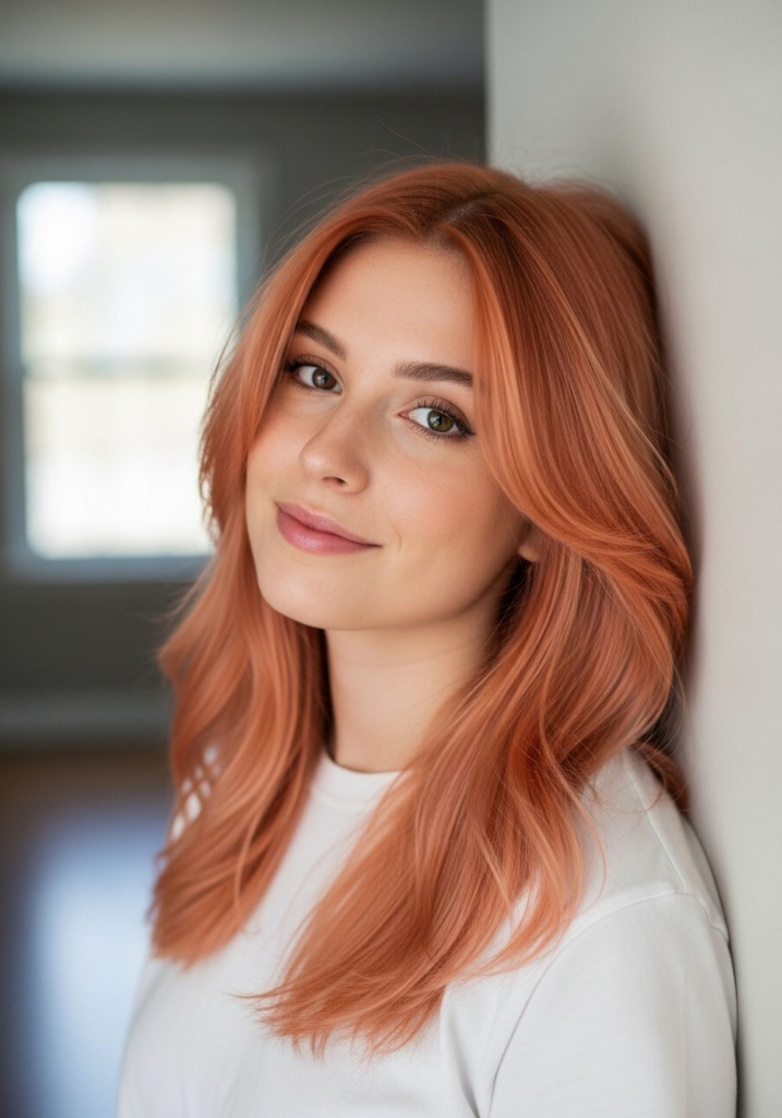Dusty apricot copper hair color has a soft peachy-red tone that feels light and fresh. I find this shade works well when someone wants warmth but prefers a lighter and more playful finish.