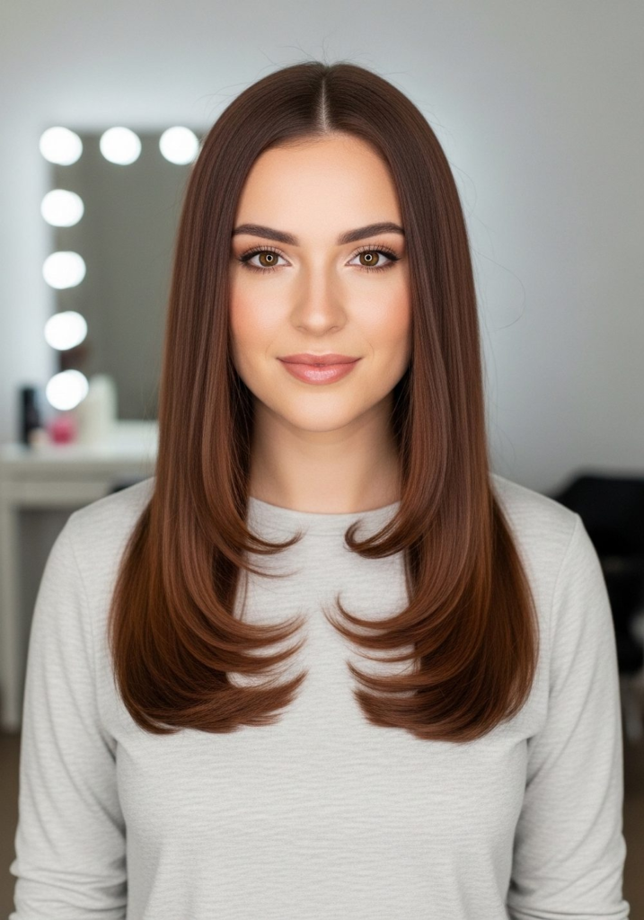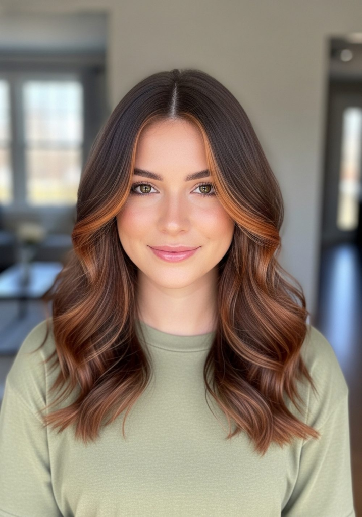 This shade works best on layered medium to long hair where the gradient can be seen clearly. Styling with volume at the crown and soft ends helps bring out the warmth and depth of the terracotta tones.