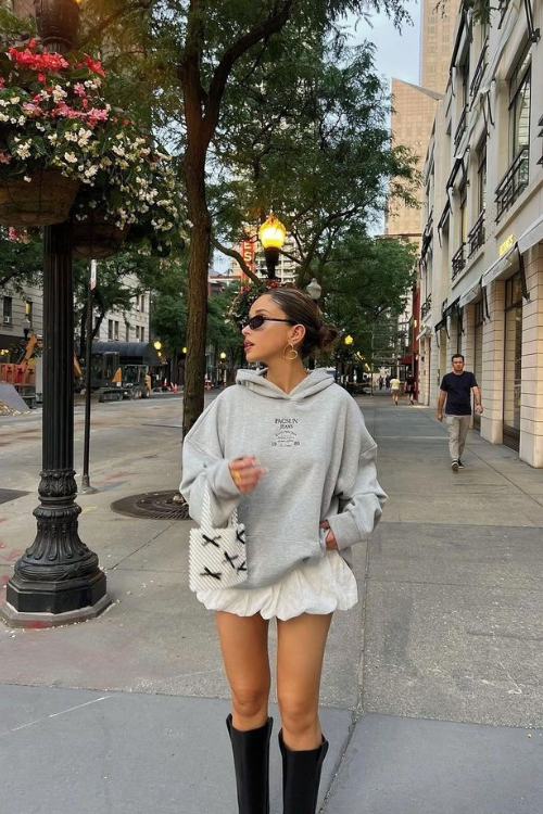 An oversized hoodie paired with a pleated mini skirt creates a trendy street-style look. Finishing it with tall boots keeps the outfit balanced and visually interesting.