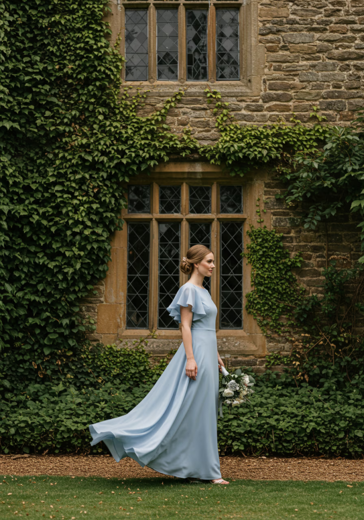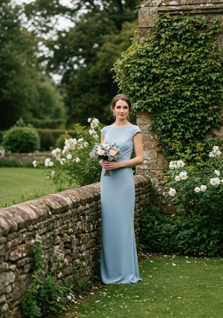 A crepe sheath dress offers structure without stiffness, creating an elegant silhouette that moves easily. In a garden setting, the matte texture and clean lines of bluebell blue feel understated yet refined, making it a timeless choice that photographs effortlessly.