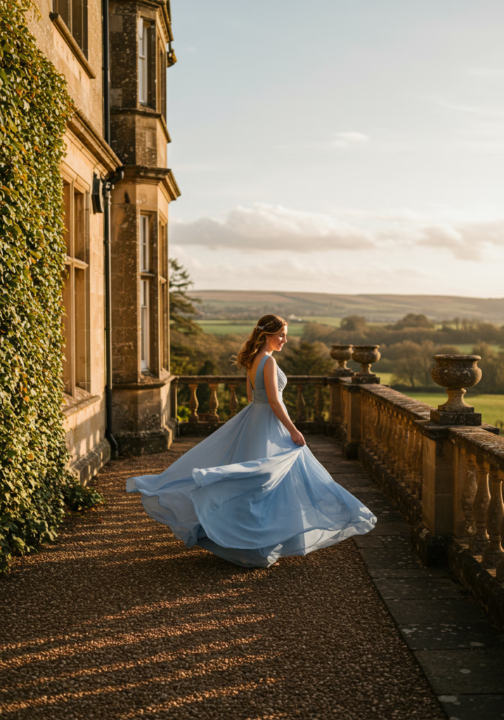 Chiffon shines when in motion, creating soft drama with every step or spin. Against historic settings, the flowing fabric adds a cinematic quality that feels organic rather than staged.