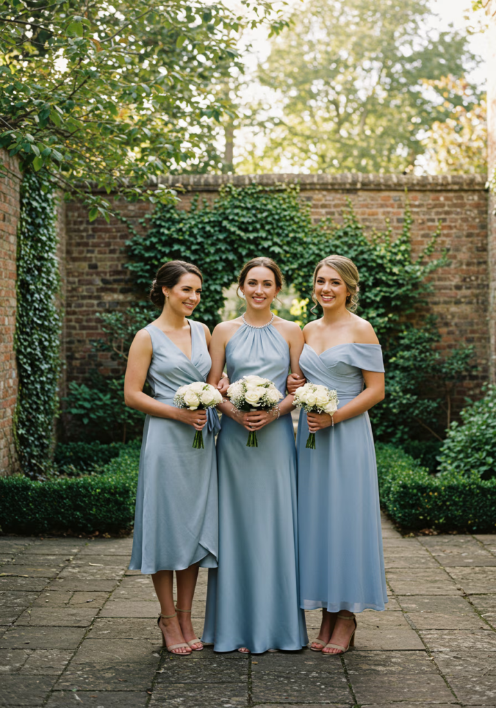 Different dress shapes in the same color allow each bridesmaid to feel confident and comfortable. The combination feels thoughtful rather than uniform, especially when paired with neutral florals.