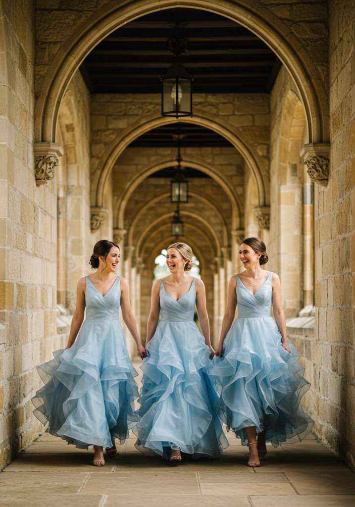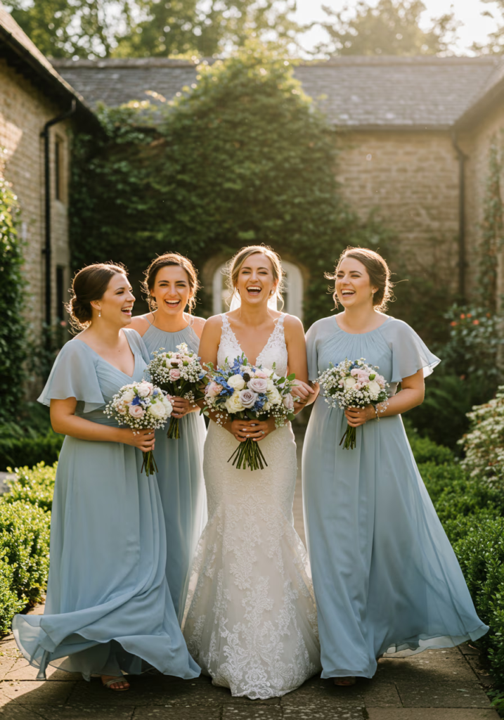Keeping one consistent color while varying silhouettes allows bridesmaids to express individuality without disrupting cohesion. Silk and satin styles in bluebell blue create depth while maintaining a unified visual palette.
