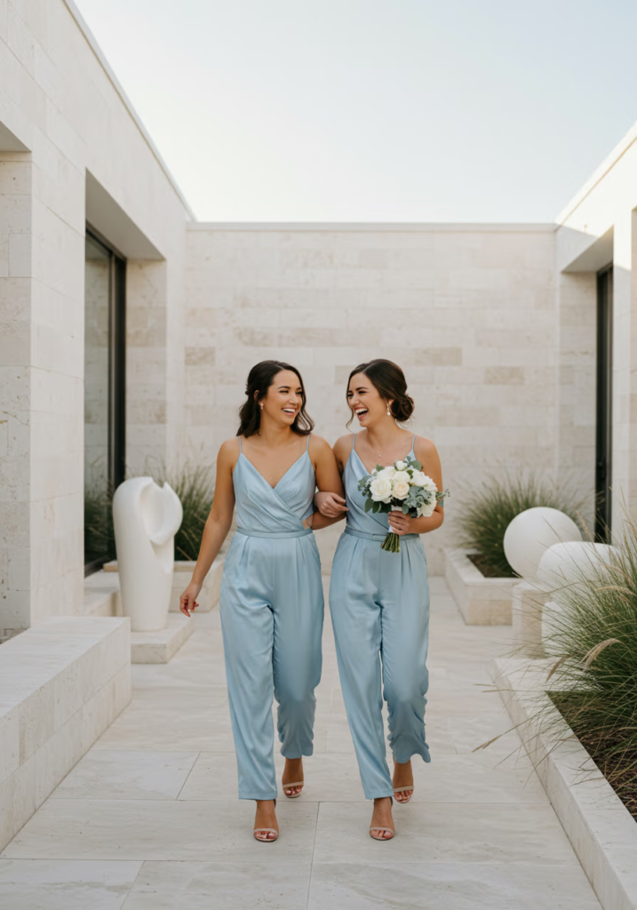 Matching jumpsuits create clean, modern lines that suit minimalist settings. The look feels intentional, confident, and forward-thinking.