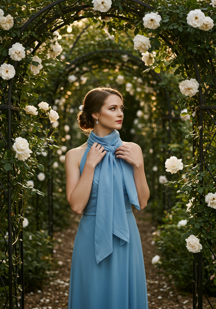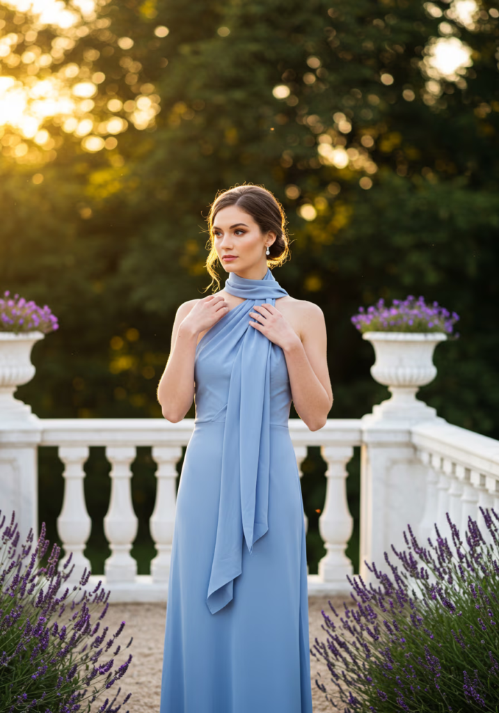 Adding a matching scarf elevates a halter gown, creating movement and visual interest while remaining cohesive and refined.