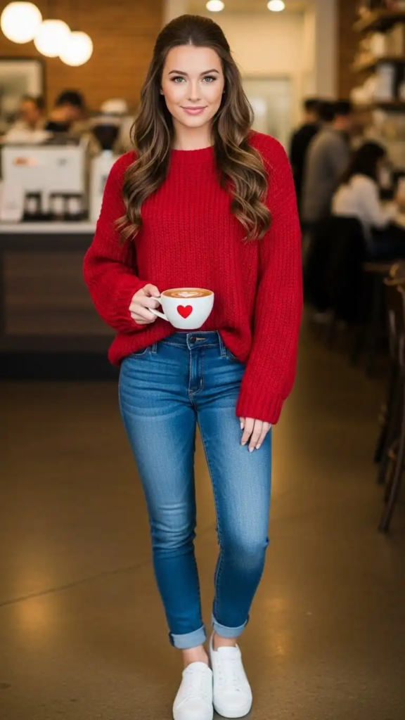 A red sweater paired with skinny jeans creates a classic Valentine’s look that feels effortless. Slightly tucking the sweater adds a relaxed touch, while ankle boots pull the outfit together for a polished finish.