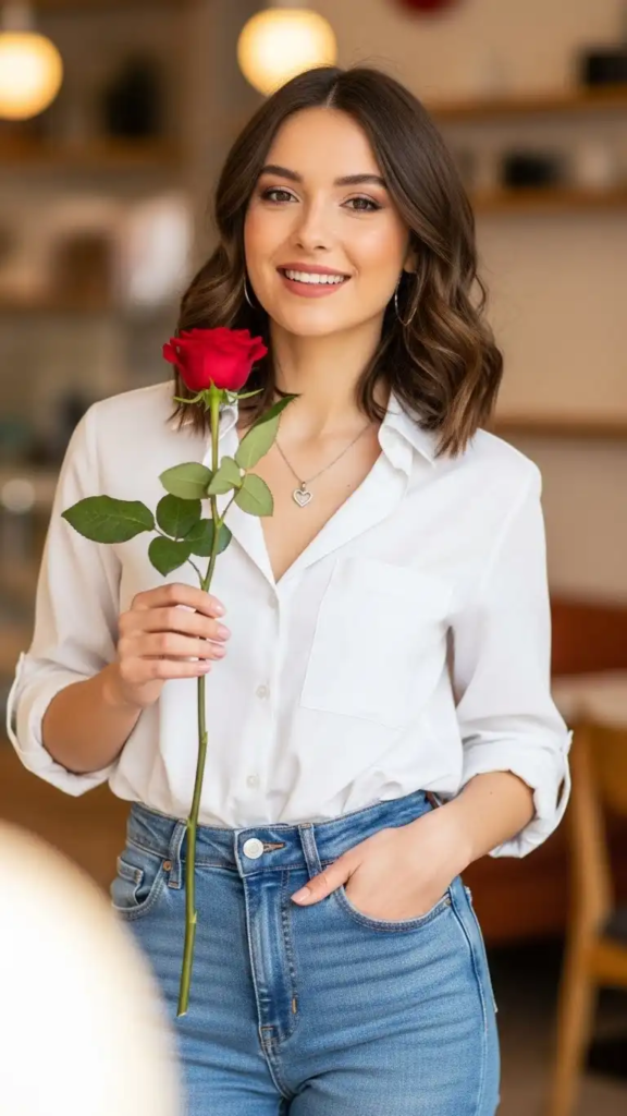 Accessories like simple jewelry and a neutral outer layer add balance. Soft makeup with a hint of color complements the outfit, making it suitable for casual dates like coffee or a walk outside.