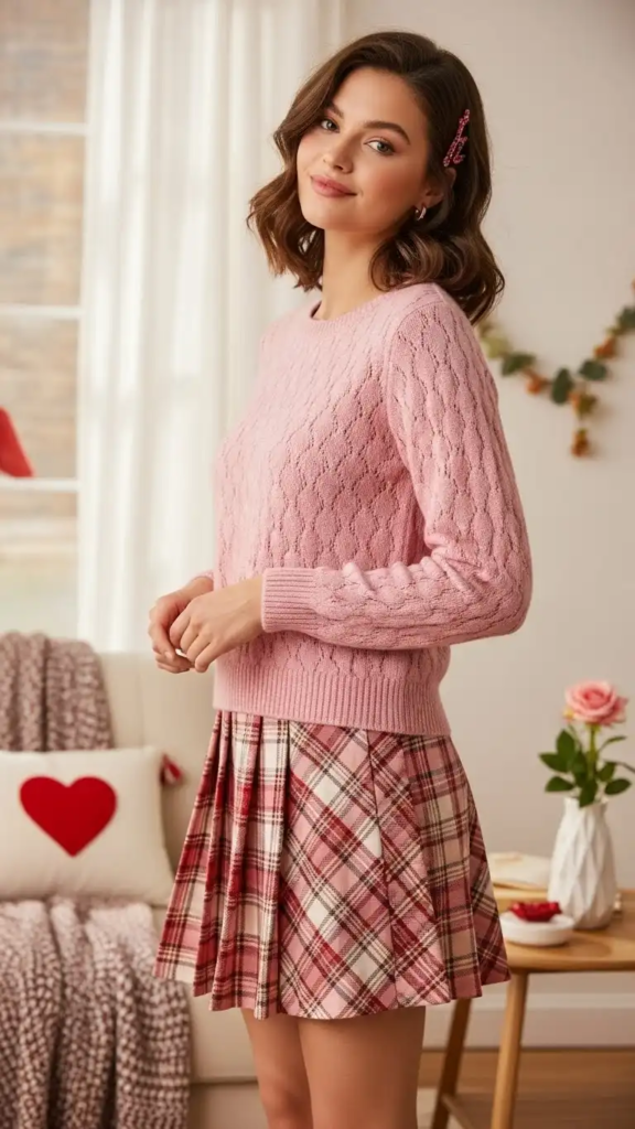 A pink knit top instantly adds a Valentine’s touch, and pairing it with a plaid skirt creates a cozy yet playful outfit. Knee-high boots and a crossbody bag keep it practical and stylish.