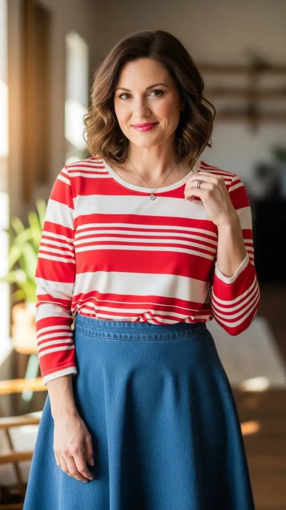 9. Striped Long-Sleeve Top with A-Line Skirt