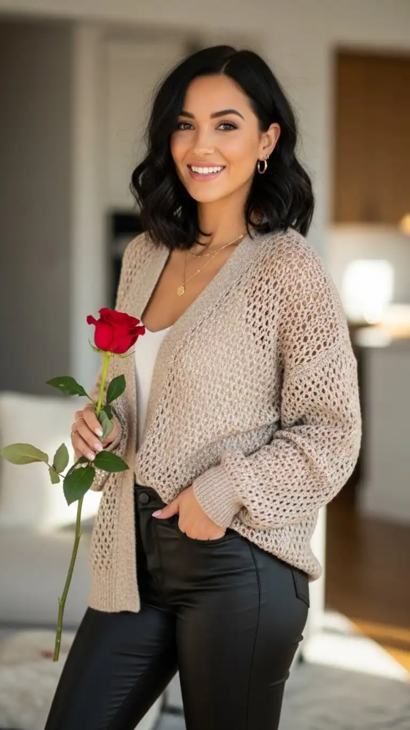 A soft cardigan paired with leather pants creates a cozy yet stylish contrast. Ankle boots and a small bag add a polished edge.