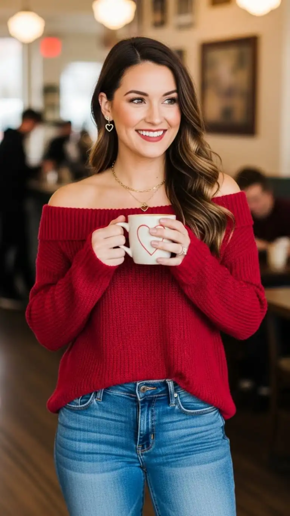 Off-shoulder sweaters add a subtle festive touch while staying relaxed. Dark jeans keep the outfit grounded and easy to wear.