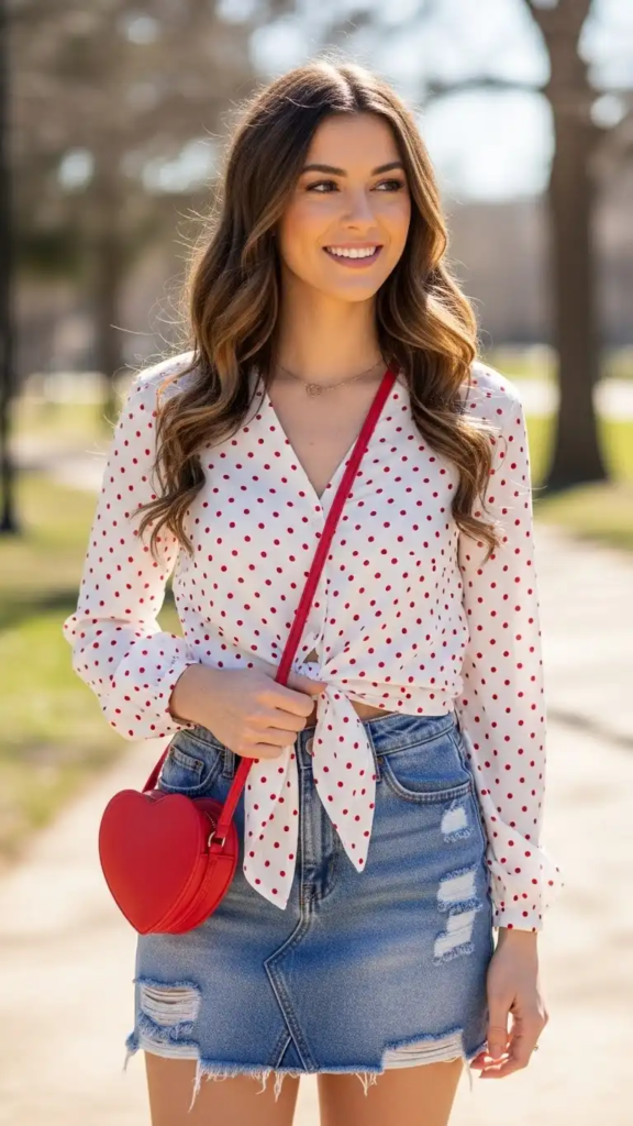 Polka dots bring a cheerful and classic vibe. When paired with a denim skirt, the outfit feels playful and effortless.