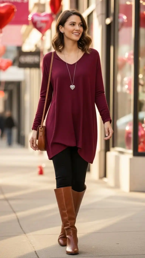 A burgundy tunic paired with leggings creates a comfortable and festive outfit. Casual footwear keeps it easy for everyday activities.