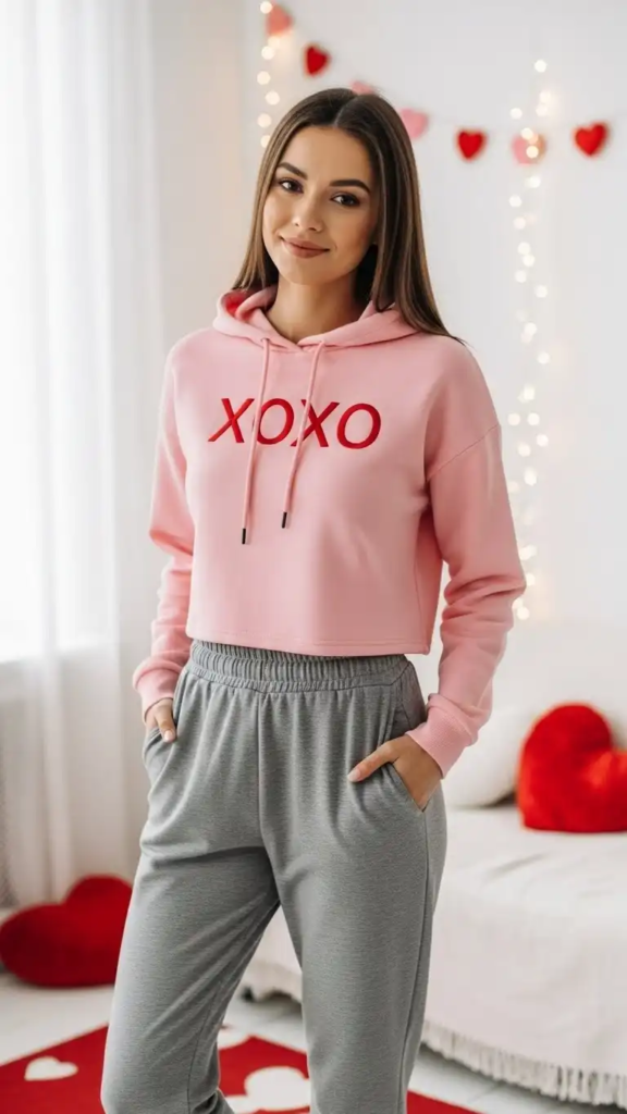 A cropped hoodie paired with joggers creates a casual yet stylish Valentine’s look. Sneakers make it practical and easy to wear.