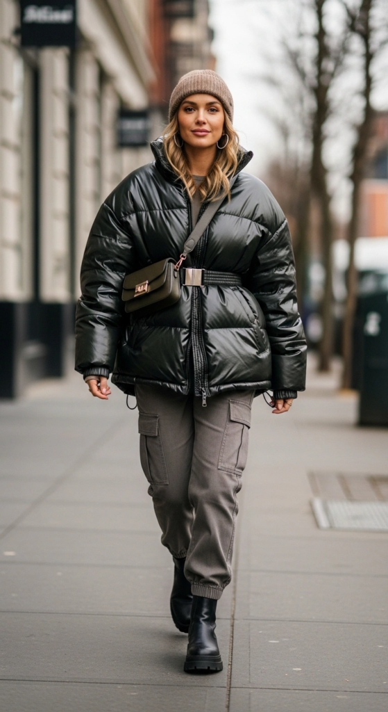 This outfit pairs a roomy puffer jacket with cargo pants for a relaxed yet stylish winter look. It’s practical for cold days while still fitting into modern street style. The combination works well for casual plans and outdoor activities.