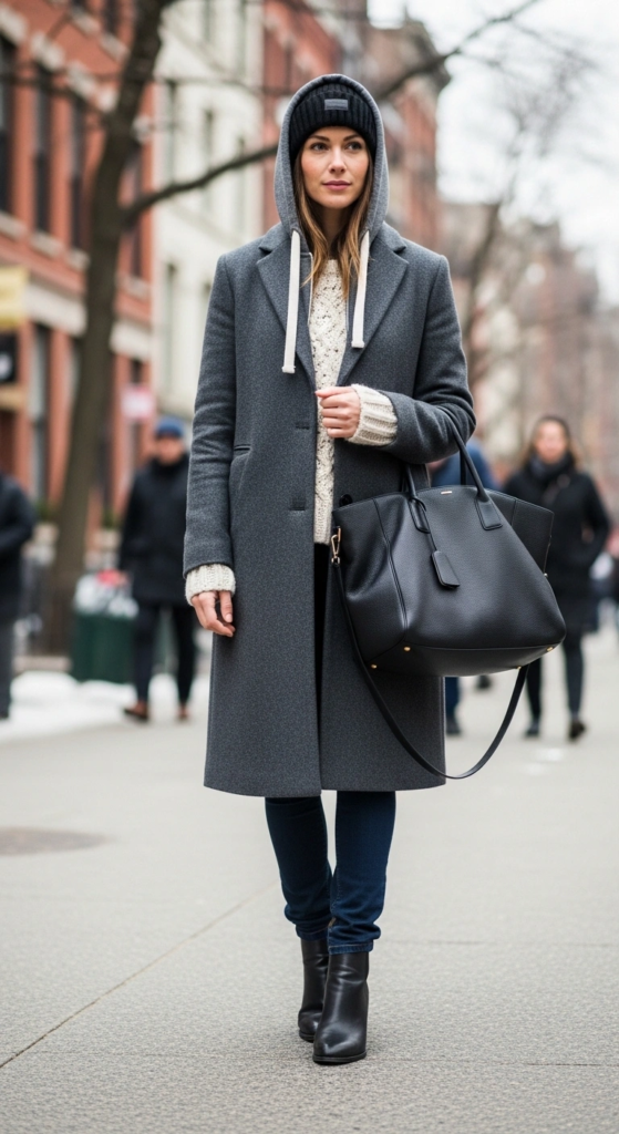 A longline coat instantly upgrades a casual outfit, especially when worn over a hoodie. This pairing blends comfort with a polished appearance and works with various bottoms.