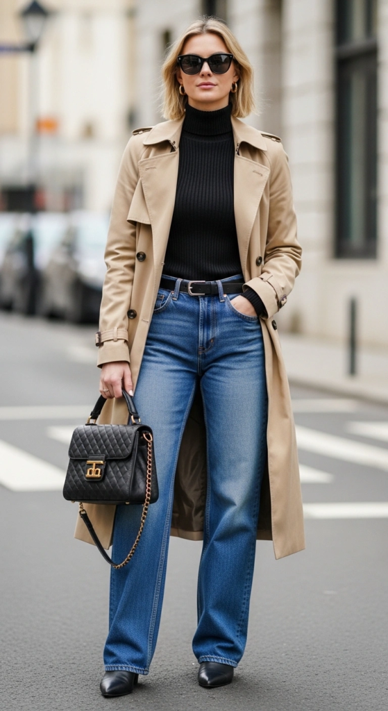 A trench coat adds structure and elegance, while baggy jeans keep the outfit relaxed. Together, they create a balanced look that feels both classic and current.