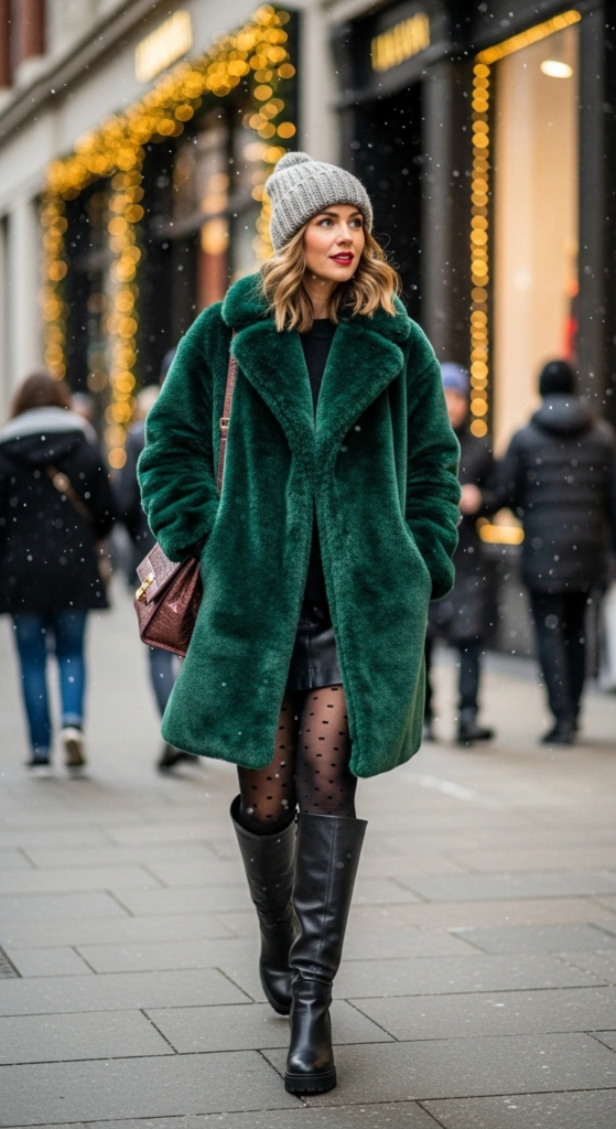 This outfit combines a statement faux fur coat with a mini skirt and tights for a bold winter look. It’s eye-catching while still appropriate for colder weather.