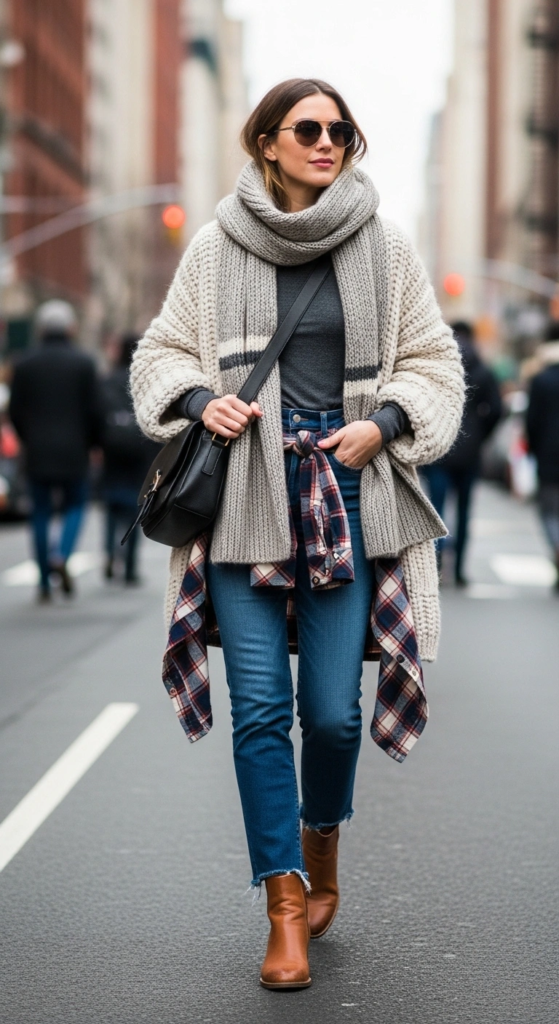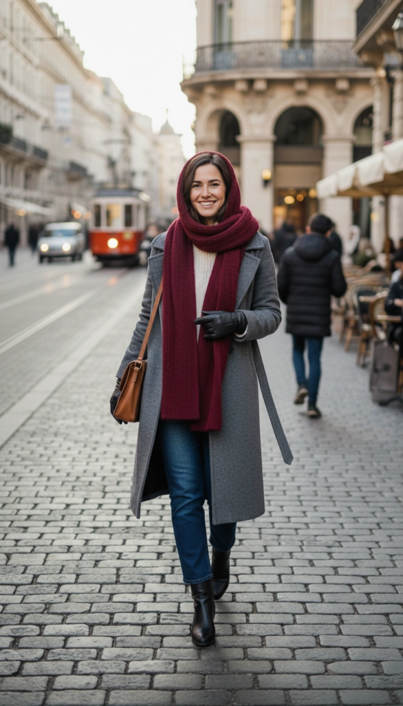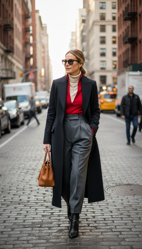 Adding knitwear or layered tops brings warmth and texture. Finishing the look with boots, loafers, and a practical bag keeps it comfortable and city-ready.