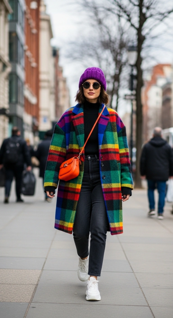 Bright colors bring life to winter outfits. Adding one bold piece can transform a simple look into something more expressive.