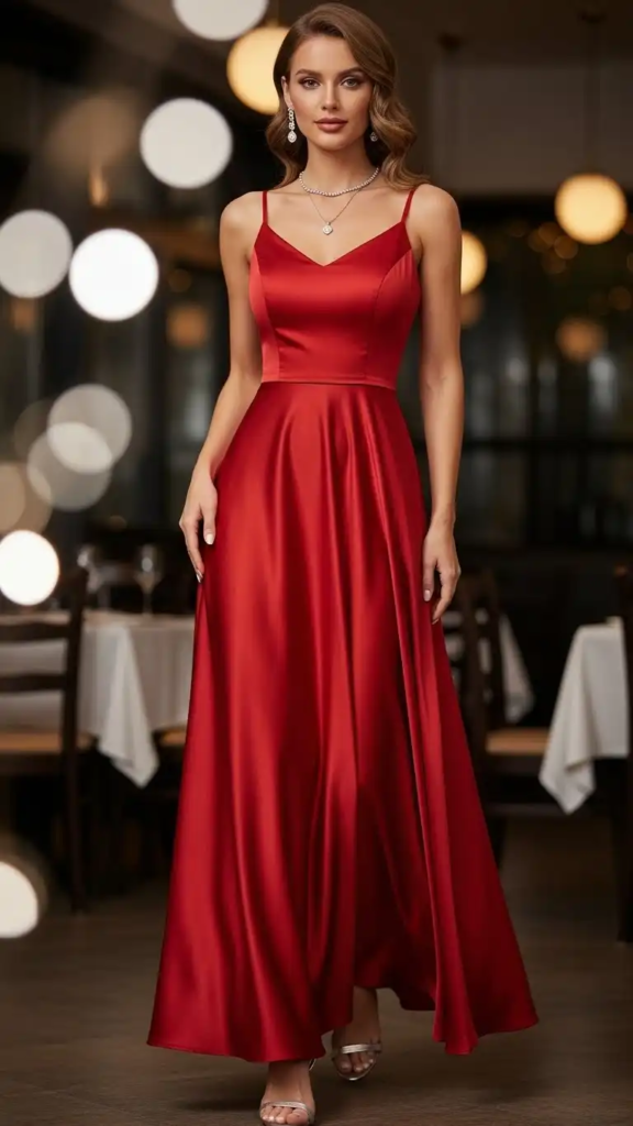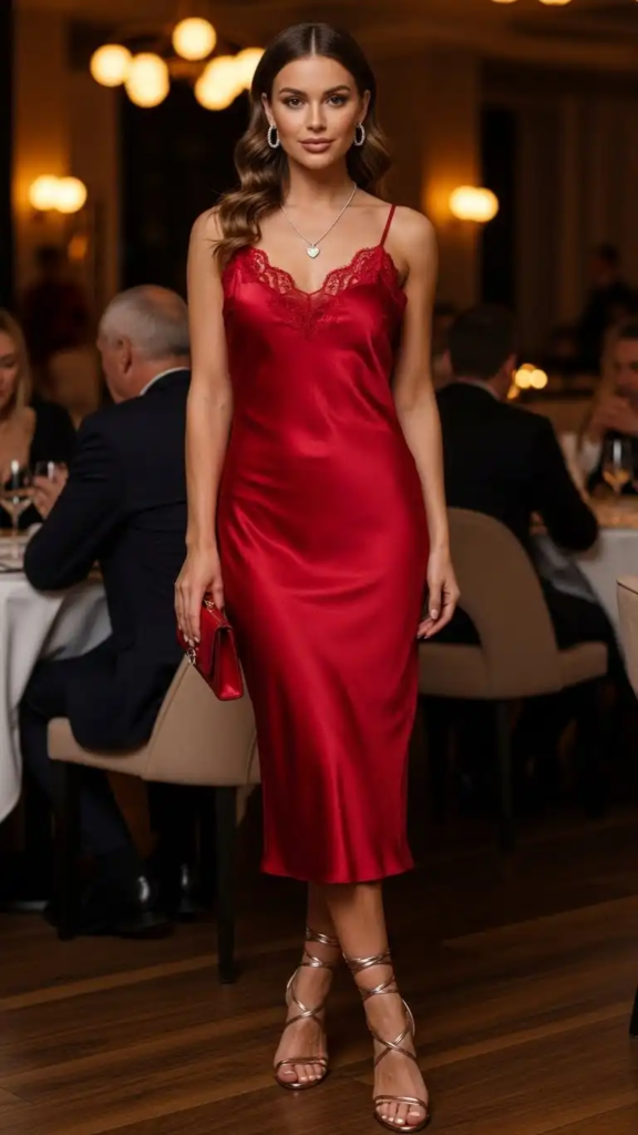 A satin slip dress brings a smooth, elegant feel to a Valentine’s outfit. The fabric reflects light beautifully, creating a naturally polished look.