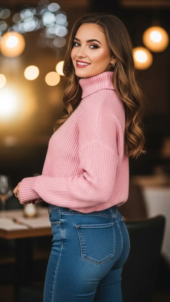 A pink sweater creates a cozy and romantic feel for a casual date. Paired with skinny jeans, the outfit looks relaxed while still feeling stylish and put together.