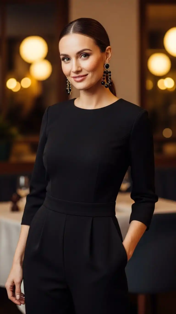 A black jumpsuit offers a sleek and modern option for Valentine’s Day. Statement earrings add personality while keeping the outfit simple and confident.