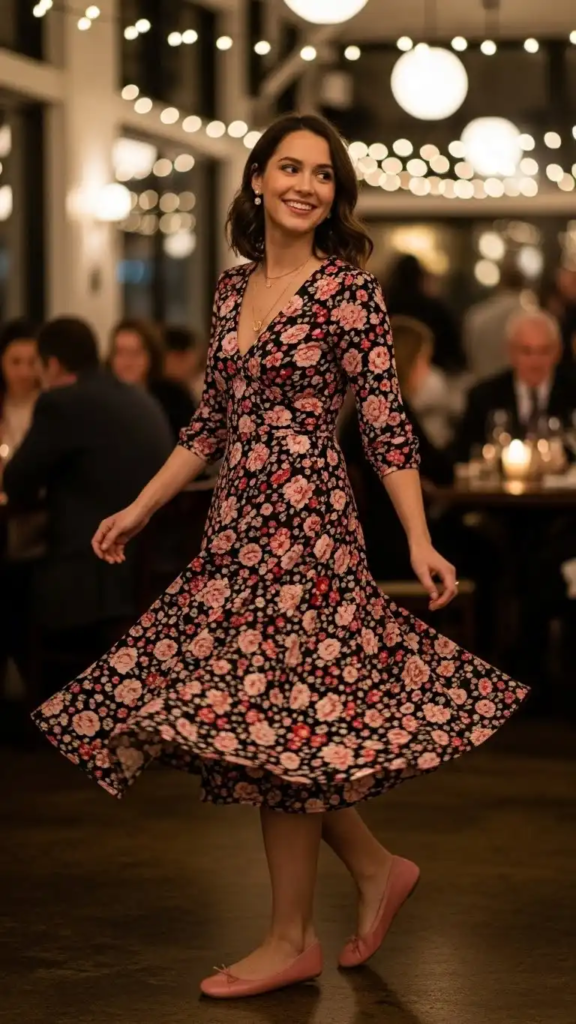4. Floral Midi Dress with Ballet Flats