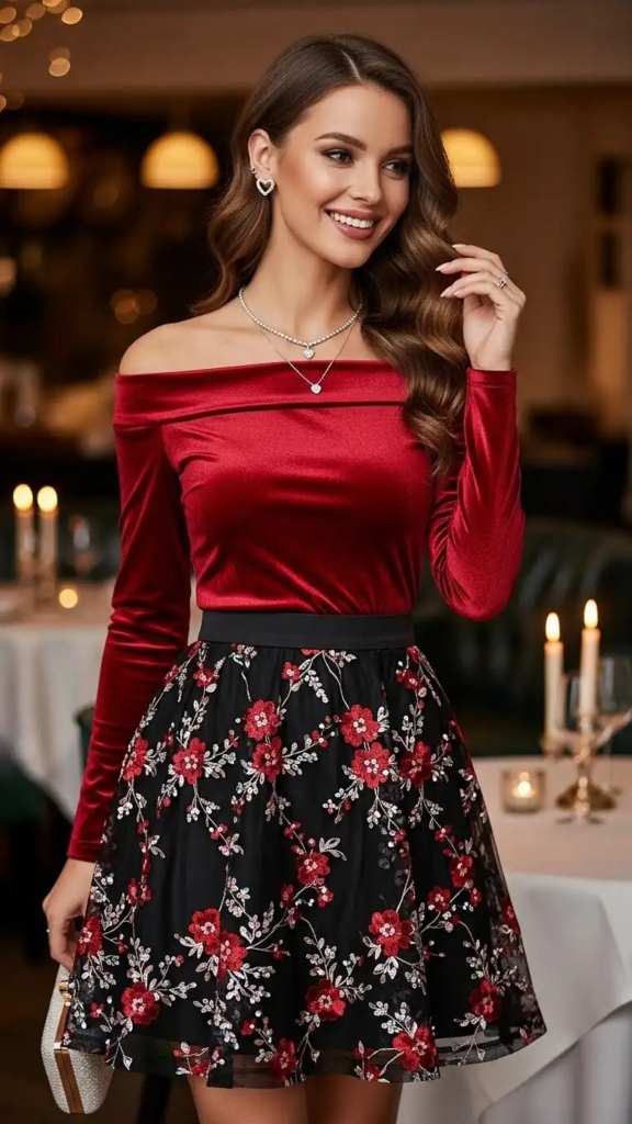 Velvet adds richness and warmth to a Valentine’s outfit. The texture feels luxurious while still being comfortable.