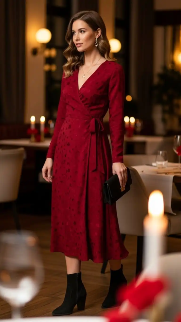 A red dress is a timeless Valentine’s choice that feels bold and elegant. Keeping accessories minimal allows the dress to stand out and creates a confident, polished look.