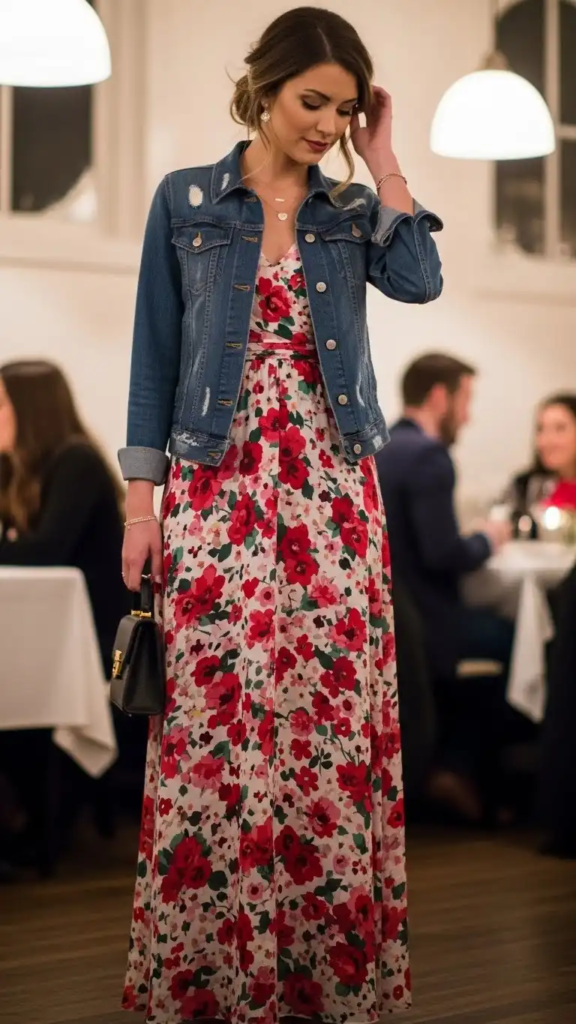 15. Denim Jacket with Floral Maxi Dress