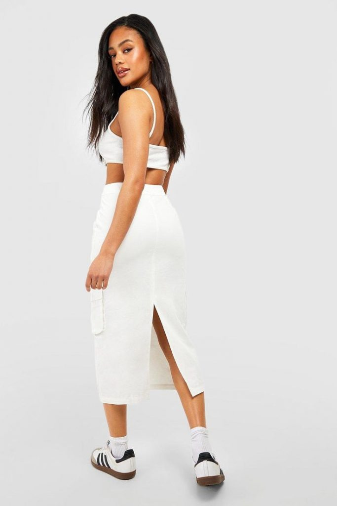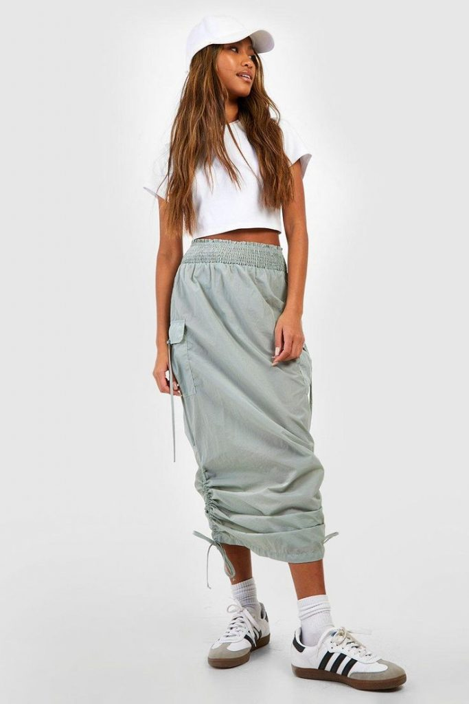 Tip: Chunky sneakers work best with structured or fitted skirts.