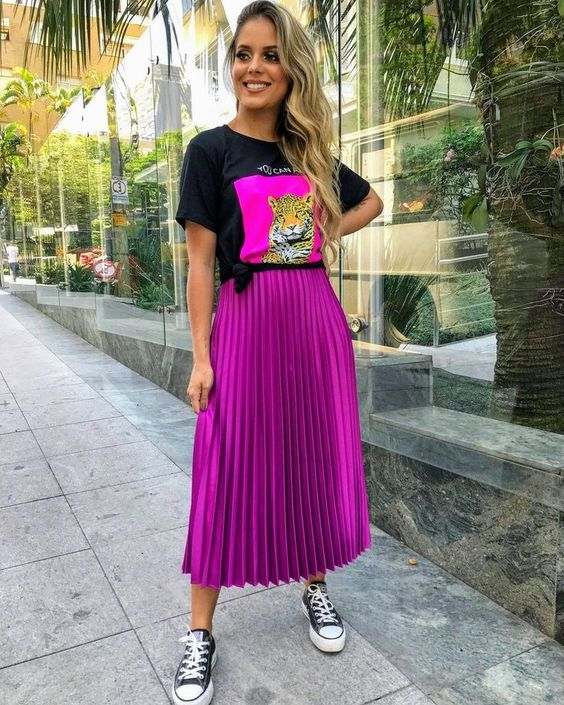 A graphic tee with a pleated skirt feels fun and expressive. I usually tie the tee slightly to define my shape. Sneakers keep it practical for long days.