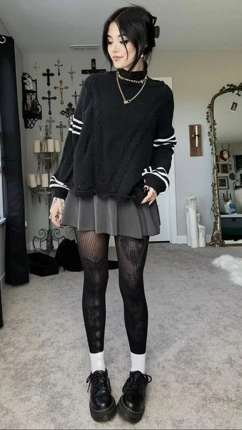 This outfit blends gothic attitude with preppy elements by pairing a bold striped sweater with a soft pleated skirt. Heavy boots and textured tights add edge, while subtle jewelry keeps the look refined. It shows that warm layers can still feel expressive and intentional.