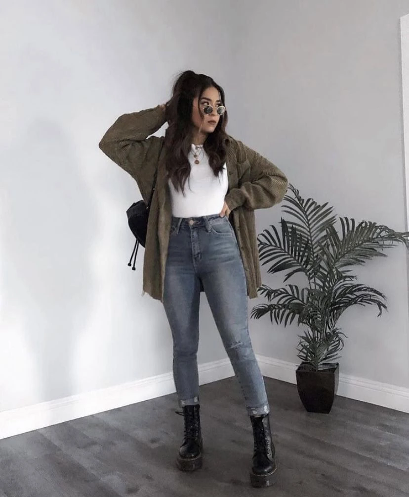 A cropped knit and vintage-style jeans create an easy balance between cozy and cool. Earthy tones and strong footwear keep the look grounded in alternative fashion.