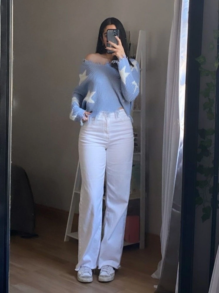 This paragraph explains how a patterned sweater paired with white denim balances warmth and style.