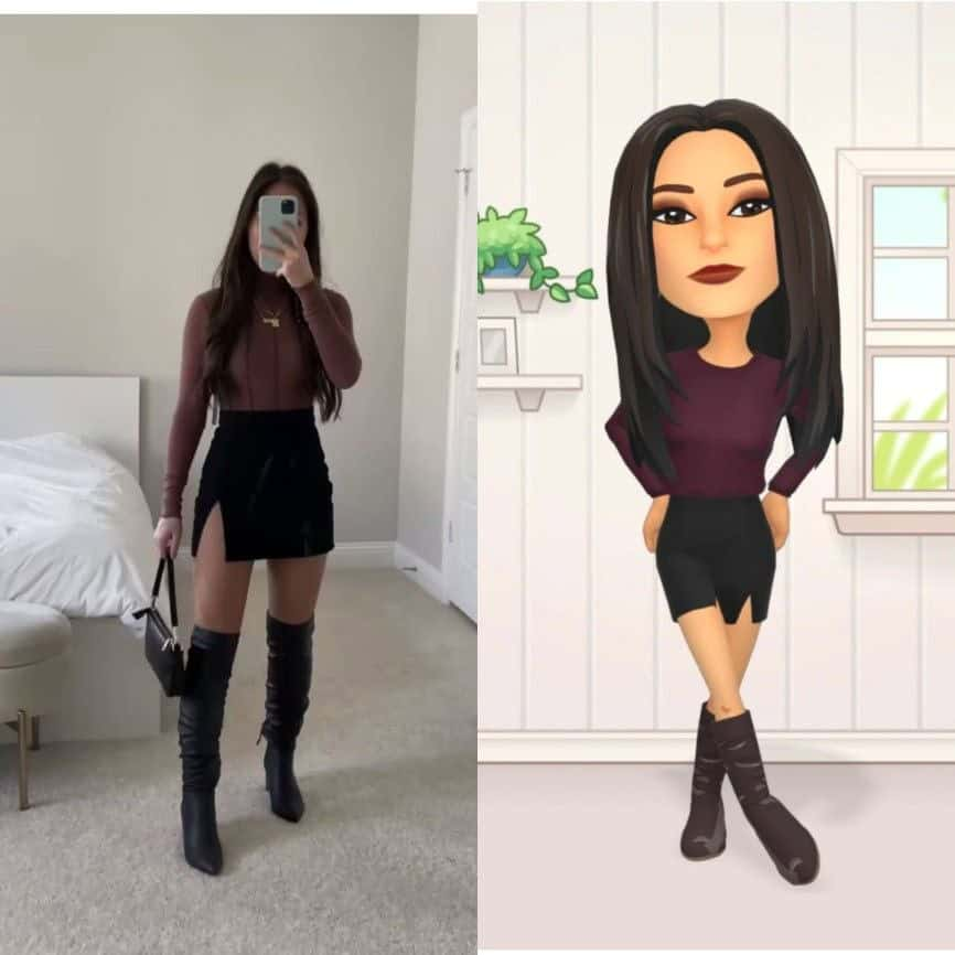 I use this look when I want my Bitmoji to feel a bit more styled but still casual. The crop top with a skirt creates a balanced outfit that works for slightly warmer fall days. Adding boots makes a big difference here. My tip is to always pair shorter outfits with boots to keep that fall vibe.