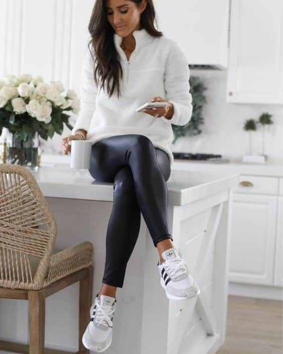 Comfort is the highlight of this winter outfit. The contrast between soft fleece and sleek leggings creates a relaxed look that still feels styled and suitable for cold days.