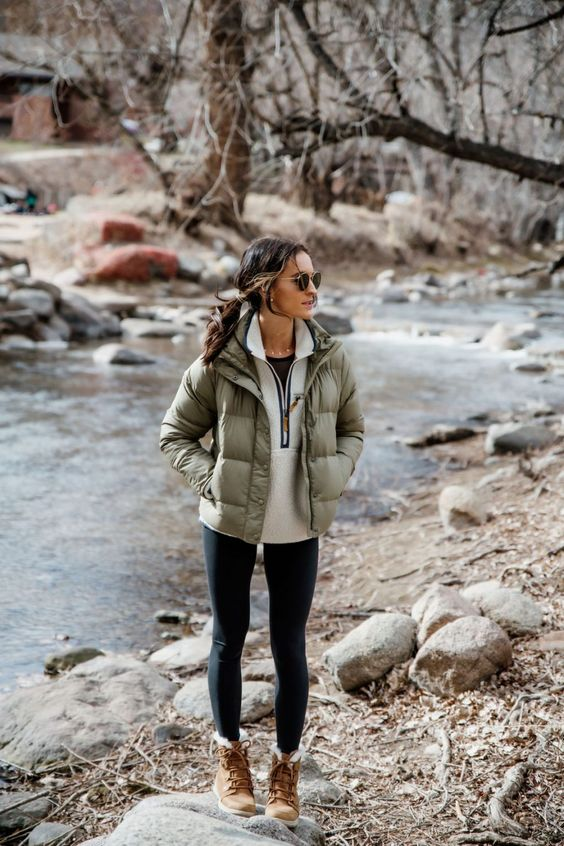 This outfit focuses on warmth without losing style. A cozy puffer layered over simple basics pairs well with practical winter boots for everyday wear.