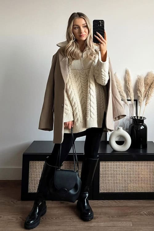 Layering is key in this winter look. Neutral knits, leggings, tall boots, and a trench coat work together to create a balanced and season-ready outfit.
