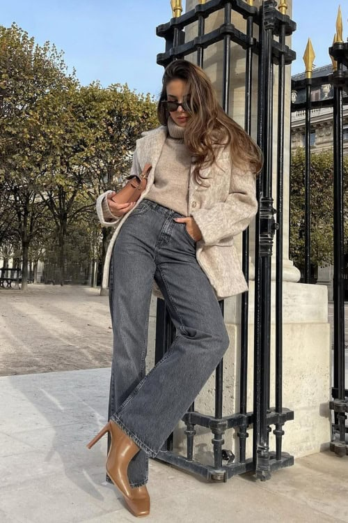 This look plays with soft neutral tones to brighten winter dressing. Light denim paired with a chunky sweater offers a warm yet airy approach to seasonal style.