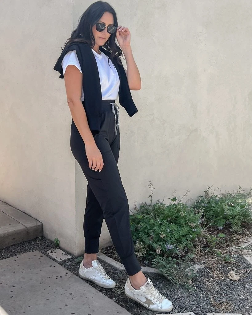 An all-black base keeps the outfit sleek. White sneakers add contrast and keep the look fresh.