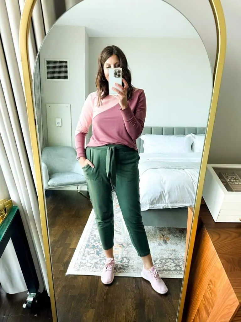 Soft colors paired with athletic pieces create a balanced look. Simple layers make the outfit flexible for different activities.
