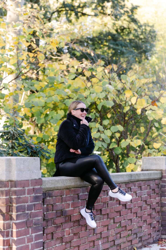 A warm outer layer adds style to simple athleisure basics. The outfit feels suitable for city wear without losing comfort.