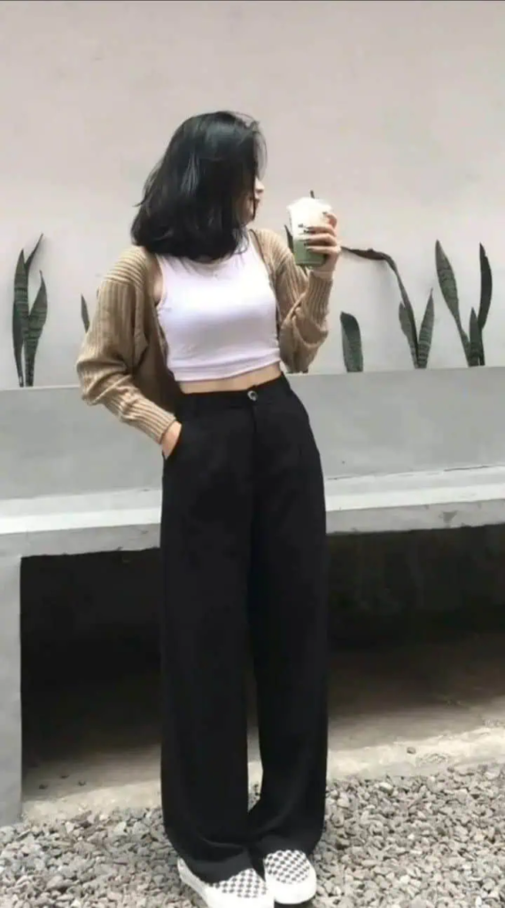 A white crop top layered with a neutral cardigan creates a relaxed yet polished look that works well for changing seasons.