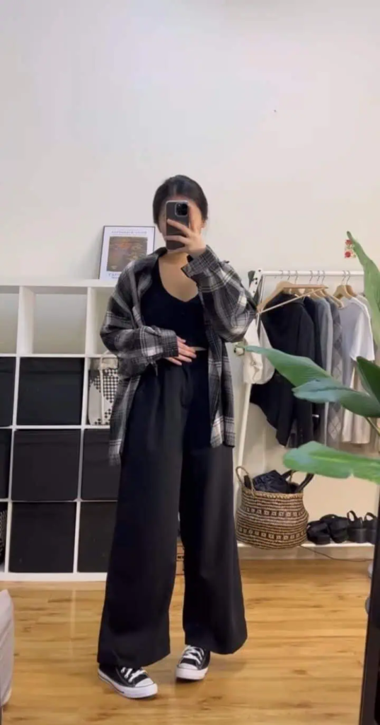 An oversized plaid shirt adds texture and personality to a simple black wide-leg base.