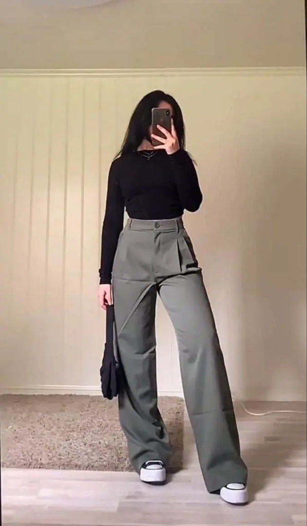 High-waisted olive trousers paired with a fitted black top create a flattering and confident look.