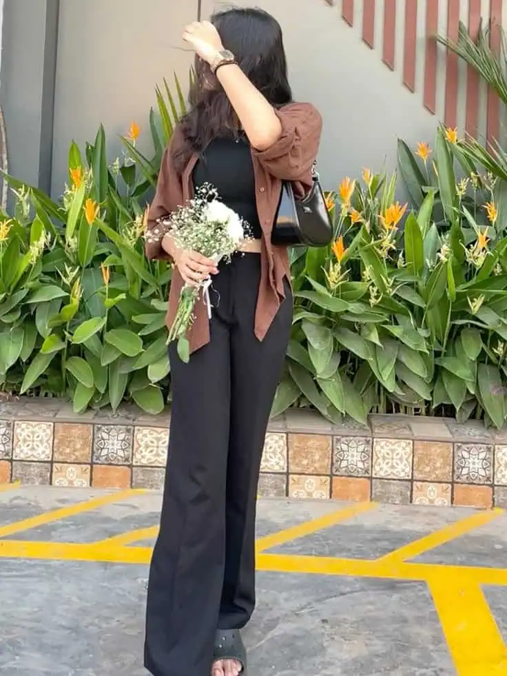 This outfit blends softness and confidence by pairing a floral button-up with a black crop top underneath. The contrast creates a balanced look that feels stylish without being overdone.